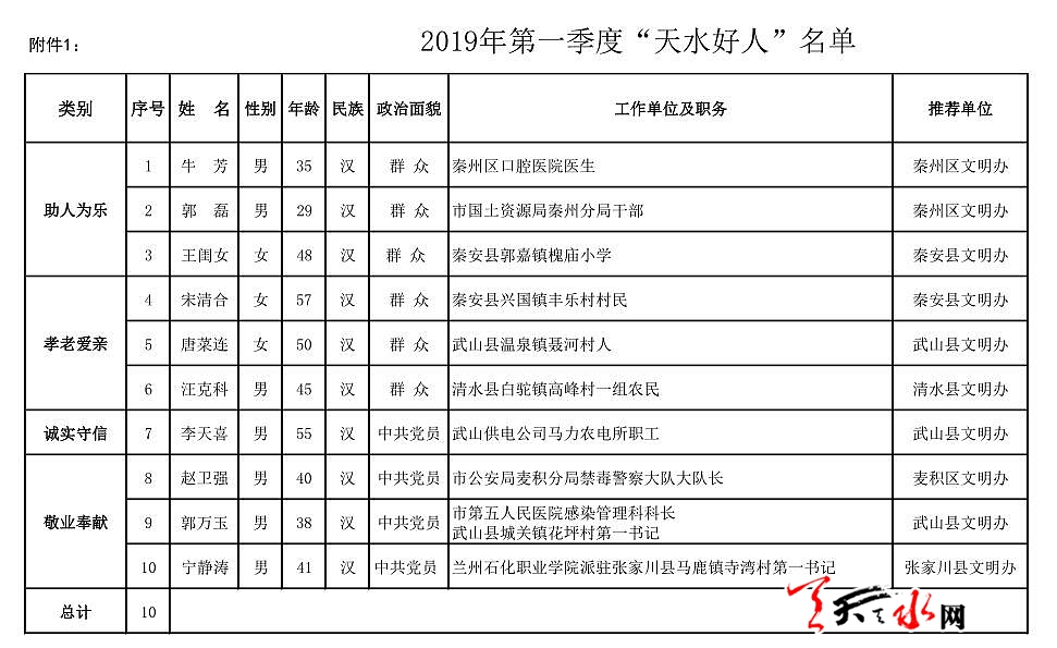 天天天水網(wǎng)訊 日前,2019年第一季度“天水好人”名單正式出爐,牛芳、郭磊玉、宋清合、李天喜、趙衛(wèi)強(qiáng)等10人榜上有名。