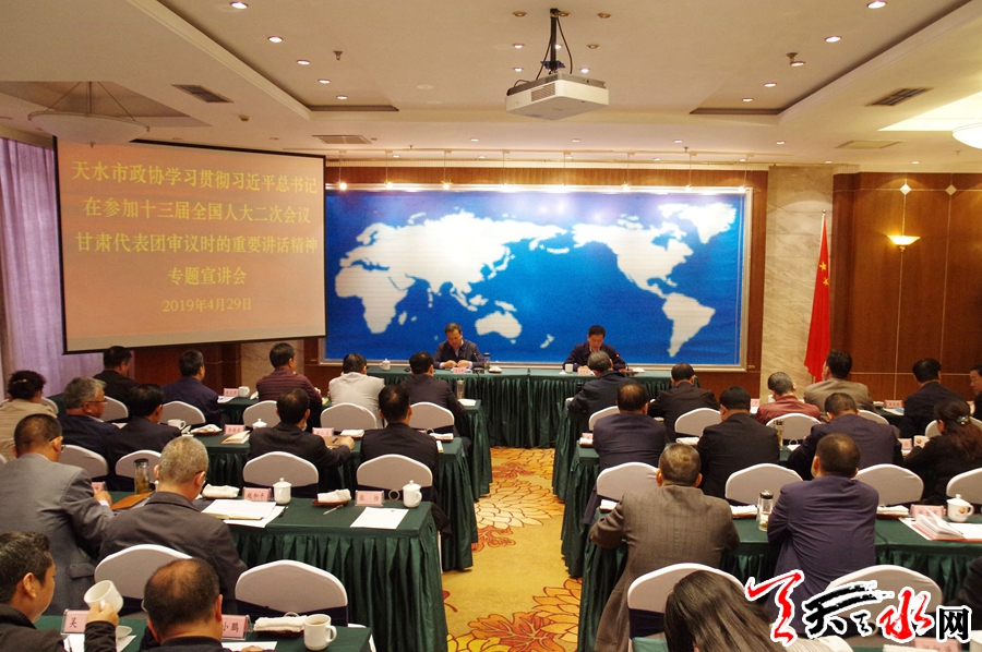 天天天水網(wǎng)訊(全媒體記者馮麗娟)4月29日,天水市政協(xié)舉辦學(xué)習(xí)貫徹習(xí)近平總書記在參加十三屆全國人大二次會議甘肅代表團審議時的重要講話精神專題宣講會。全國人大代表、市政協(xié)副主席馬百齡做專題宣講,市政協(xié)副主席蘇定武主持宣講會,市政協(xié)副主席郭明興、屈光平,市政協(xié)秘書長劉鋒,黨組成員賈忠慧,以及市政協(xié)機關(guān)全體干部職工,各縣區(qū)政協(xié)主席、秘書長(辦公室主任)共70多人參加專題宣講會。