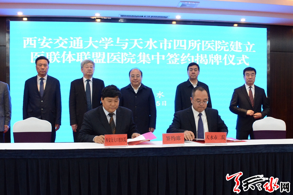 天天天水網(wǎng)訊【全媒體記者馬放】5月5日,西安交通大學(xué)與天水市第二人民醫(yī)院、天水市婦幼保健院、天水市第四人民醫(yī)院、天水市四〇七醫(yī)院建立醫(yī)聯(lián)體聯(lián)盟醫(yī)院集中簽約揭牌儀式在我市舉行。這標(biāo)志著我市四所醫(yī)院與西安交通大學(xué)正式建立協(xié)作醫(yī)院關(guān)系,對于進一步深化我市醫(yī)藥衛(wèi)生體制改革,推動醫(yī)療衛(wèi)生在重點學(xué)科上取得新突破,促進衛(wèi)生健康事業(yè)高質(zhì)量發(fā)展具有積極的促進作用。