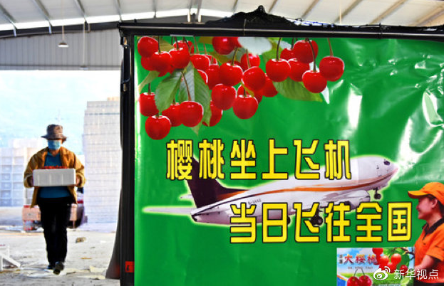 山東省沂源縣歷山街道北大巖村,一名果農搬運準備航運外銷的大櫻桃。 新華社發(fā)(趙東山 攝)