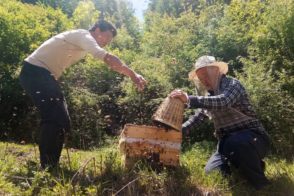 5月11日,清水縣秦亭鎮(zhèn)喬李村致遠(yuǎn)種養(yǎng)殖農(nóng)業(yè)合作社的中蜂養(yǎng)殖技術(shù)人員在蜜蜂自然分蜂后進(jìn)行收蜂。