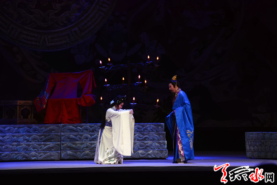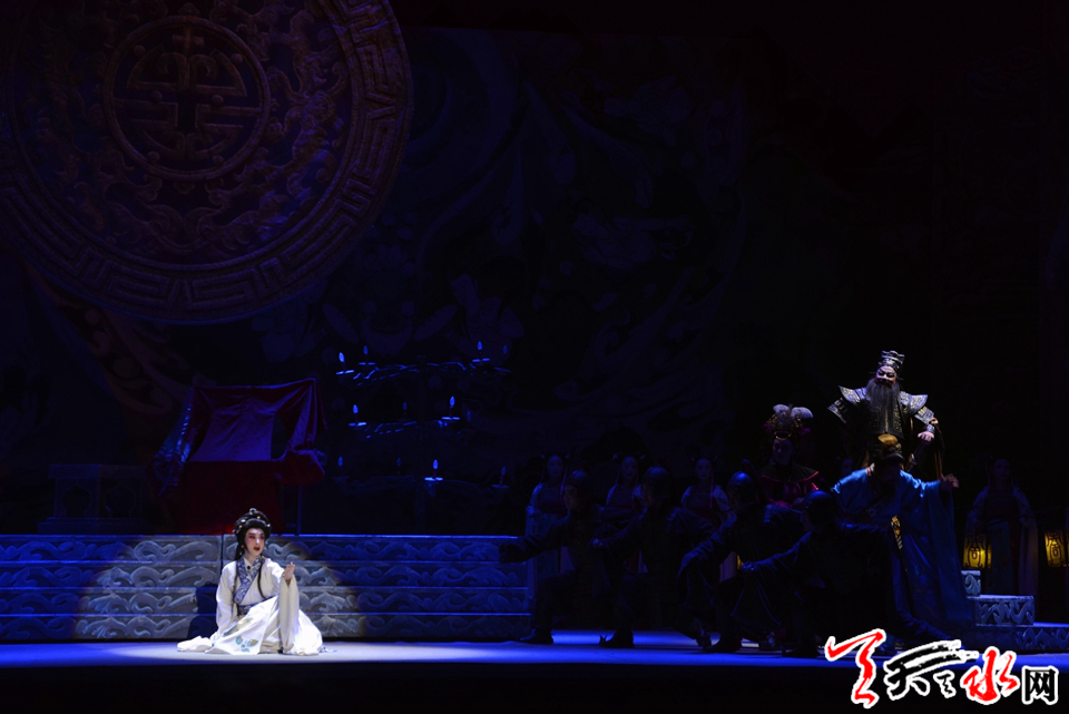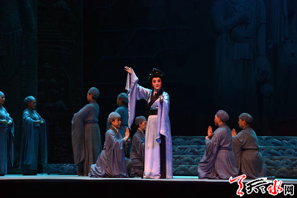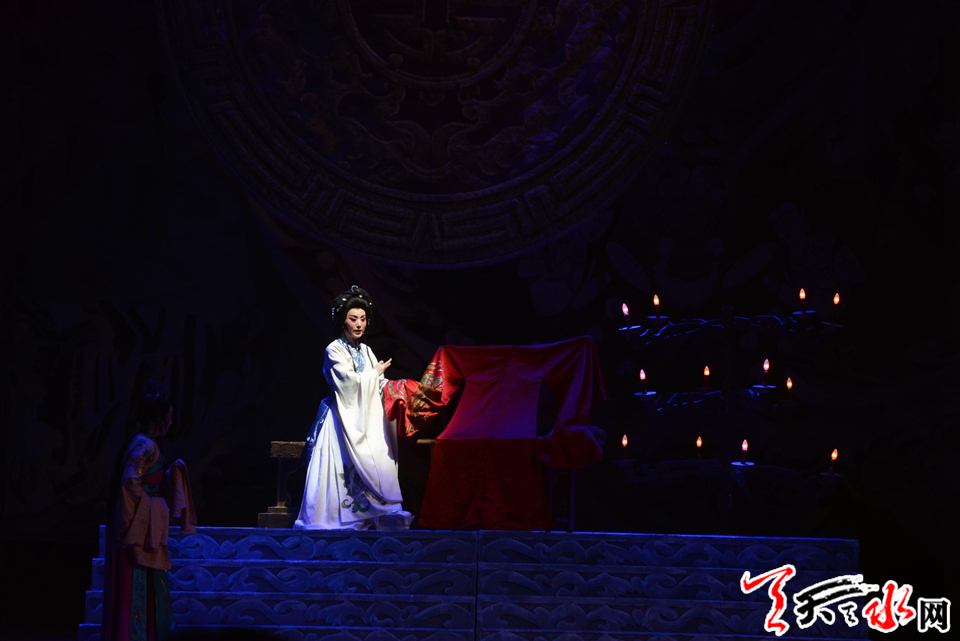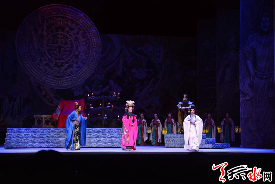 當晚,秦州劇院內(nèi)板胡悠揚,鑼鼓鏗鏘,由特邀國家一級編劇曹銳精心打磨提升的《麥積圣歌》徐徐拉開帷幕。《麥積圣歌》以麥積山44號石窟乙弗氏為原型,用凄婉壯美的故事,塑造了一位集佛性之慈、人性之善、母性之美于一身的偉大女性形象。講述的是南北朝時期,東魏、西魏兩國爭相交好柔然國,以抗對方,西魏文帝元寶炬與柔然和親,在柔然公主和柔然大軍的逼迫下,先廢太子,再廢皇后。乙弗皇后一再退讓,初貶冷宮,進而又遭柔然公主和宇文泰陷害,被遣麥積山兩次削發(fā)為尼,最終自焚而死的凄惋故事。