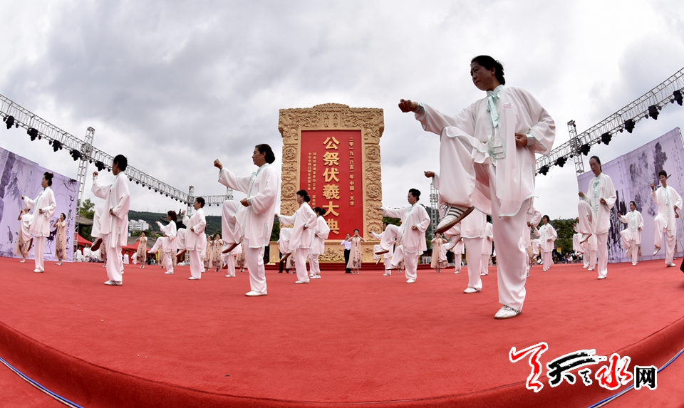 ????當(dāng)天上午,來自天水市的17支太極拳表演隊和德國、瑞士等歐洲伏羲太極道館負(fù)責(zé)人參加了展演活動。展演突出了伏羲文化的主題,以“問道伏羲,尋根天水”的文化品牌,形成了鮮明的地方特色。展演中豐富多彩的太極拳表演形式,充分展現(xiàn)了太極拳動靜結(jié)合,剛?cè)嵯酀?jì),天人合一,自然健康的東方神韻和羲皇故里人民積極向上,充滿活力的精神風(fēng)貌。