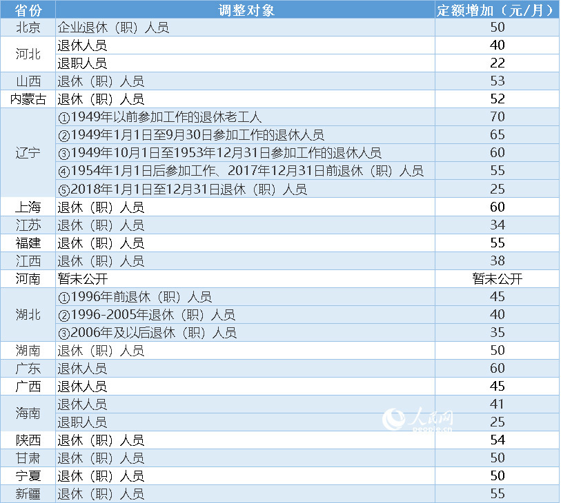 表:19省份2019年退休人員基本養(yǎng)老金定額調(diào)整情況一覽