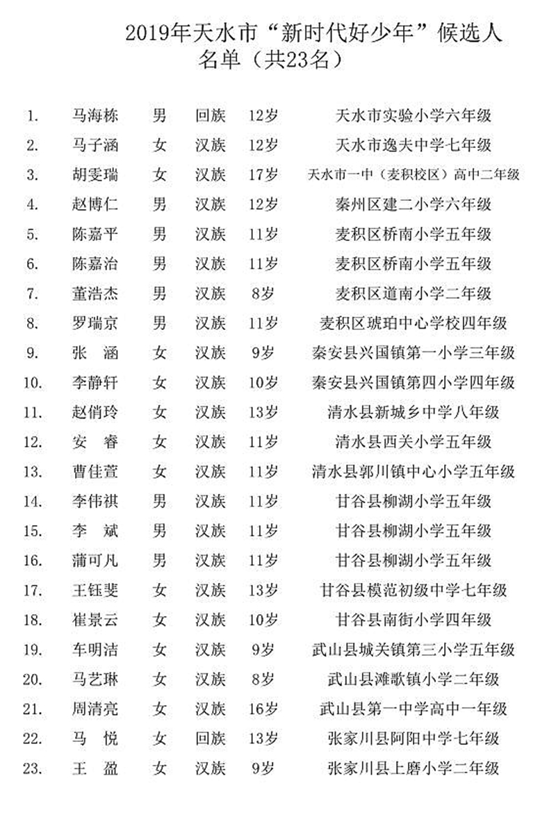 經(jīng)全市各中小學(xué)校推薦,各縣區(qū)初評(píng),市評(píng)審組評(píng)選,共評(píng)選出擬命名的2019年天水市“新時(shí)代好少年”正式候選人23名,現(xiàn)將名單向社會(huì)進(jìn)行公示,接受社會(huì)監(jiān)督。公示期間,若對(duì)正式候選人有異議,請(qǐng)向天水市文明辦反映。反映情況必須實(shí)事求是,客觀公正,并署真實(shí)姓名、電話、住址。