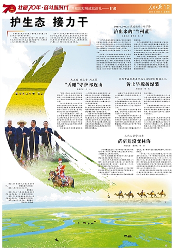 扛好責(zé)任筑屏障,生態(tài)文明底色更加鮮亮。70年來(lái),全省共完成造林1.56億畝、天保工程3.15億畝,有效發(fā)揮了國(guó)家西部生態(tài)安全屏障功能,涌現(xiàn)出以古浪縣八步沙“六老漢”三代人時(shí)代楷模為代表的一批先進(jìn)典型。這兩年,我們深入貫徹習(xí)近平總書(shū)記建設(shè)“經(jīng)濟(jì)發(fā)展、山川秀美、民族團(tuán)結(jié)、社會(huì)和諧的幸福美好新甘肅”重要指示,牢固樹(shù)立“綠水青山就是金山銀山”理念,堅(jiān)持走生態(tài)優(yōu)先、綠色發(fā)展之路,打好污染防治攻堅(jiān)戰(zhàn),整治祁連山等生態(tài)破壞問(wèn)題,實(shí)施重點(diǎn)生態(tài)工程,推動(dòng)生態(tài)環(huán)境持續(xù)好轉(zhuǎn),大氣、水、土壤得到有效保護(hù)。開(kāi)展全域無(wú)垃圾專(zhuān)項(xiàng)治理和農(nóng)村人居環(huán)境整治,創(chuàng)建鄉(xiāng)村旅游示范村100個(gè),建成“美麗鄉(xiāng)村”示范村900個(gè),人民群眾享受到了更美好的環(huán)境。