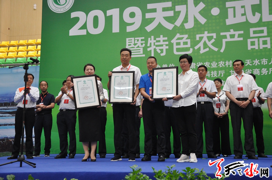 開幕式上,舉行了國家地理標志證明商標及綠色食品A級產(chǎn)品授牌頒證儀式。甘肅省市場監(jiān)督管理局標準化處副處長張曉峰給武山縣頒發(fā)“武山豆角”國家地理標志證明商標。甘肅省農(nóng)業(yè)農(nóng)村廳市場與信息化處處長武宏安恰武山縣頒發(fā)“武山萵筍”“武山辣椒”“武山油白菜”綠色食品A級產(chǎn)品證書。