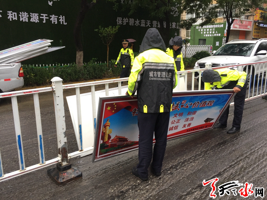 天天天水網(wǎng)訊 9月13日,中秋小長(zhǎng)假第一天。秦州區(qū)執(zhí)法局組織執(zhí)法人員,冒著大雨對(duì)43條主次干道兩側(cè)護(hù)欄、建筑物以及構(gòu)筑物上違規(guī)設(shè)置或陳舊破損的廣告設(shè)施進(jìn)行了集中整治。