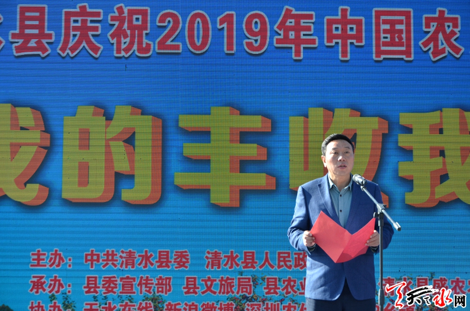 ????天天天水網(wǎng)訊【記者 張文都 實習(xí)生 鞏麗珍】春種一粒粟,秋收萬顆子。軒轅故里,大美清水,正逢金秋颯爽,碩果累累之季。9月21日,清水縣第二屆“中國農(nóng)民豐收節(jié)”在豐望鄉(xiāng)高河村隆重拉開帷幕。來自清水縣四大組織領(lǐng)導(dǎo)、縣直各部門負責(zé)人、18鄉(xiāng)鎮(zhèn)鄉(xiāng)鎮(zhèn)長等1000余人一起分享農(nóng)民朋友們收獲的喜悅,展現(xiàn)脫貧攻堅的精彩成果和新時代廣大農(nóng)民群眾的時代風(fēng)采,共同展望美好未來,同祝祖國70周年華誕。
