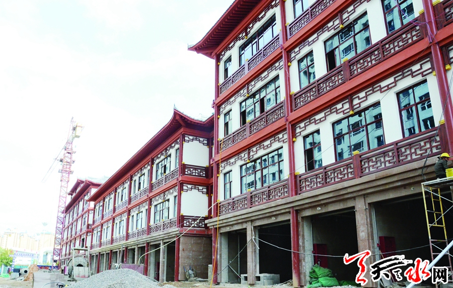 ??? 走進(jìn)武山縣寧遠(yuǎn)文化藝術(shù)中心項(xiàng)目建設(shè)現(xiàn)場(chǎng),三棟拔地而起的四層仿古建筑立刻映入眼簾,飛檐斗拱、亭臺(tái)樓閣、古色古香,呈現(xiàn)出傳統(tǒng)建筑自然恬淡的風(fēng)情。工人們正在已建成的仿古建筑內(nèi)進(jìn)行裝修裝飾工作、干勁正酣。