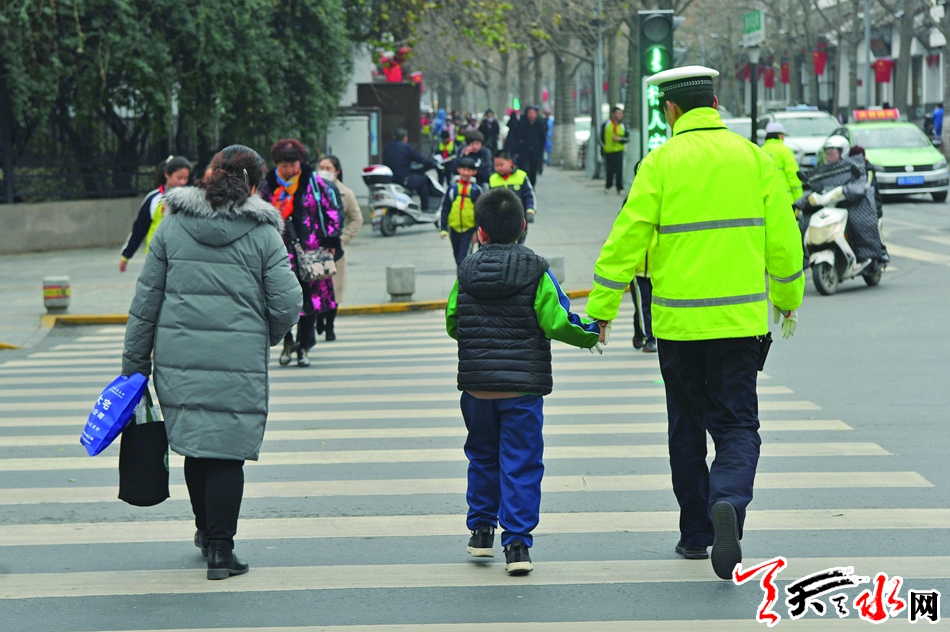 關(guān)注未成年人,交警帶領(lǐng)小學(xué)生過馬路。