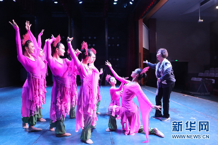 11月23日,敦煌舞教學(xué)創(chuàng)始人高金榮為蘭州文理學(xué)院藝術(shù)職業(yè)學(xué)院敦煌舞蹈班的學(xué)生排練敦煌舞劇《沙漠紅柳》。新華社記者郎兵兵 攝