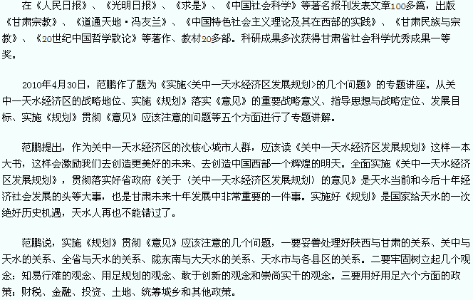 ??? 范鵬 甘肅省社會(huì)科學(xué)院黨委書(shū)記、院長(zhǎng),教授、研究員。兼任中國(guó)哲學(xué)史學(xué)會(huì)現(xiàn)代哲學(xué)專(zhuān)業(yè)委員會(huì)副會(huì)長(zhǎng),中國(guó)哲學(xué)史學(xué)會(huì)理事,中國(guó)宗教學(xué)會(huì)理事,甘肅省哲學(xué)會(huì)會(huì)長(zhǎng),甘肅省委省政府決策咨詢(xún)顧問(wèn),蘭州大學(xué)、西北師范大學(xué)兼職教授、碩士研究生導(dǎo)師,中國(guó)統(tǒng)一戰(zhàn)線理論研究會(huì)民族宗教理論甘肅研究基地研究員。