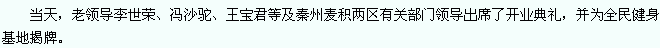 ??? 天天天水網(wǎng)訊(記者 元存 曉霞 麗霞)11月23日,麥積區(qū)舉行全民健身基地暨海濱健身會(huì)所開業(yè)典禮,正式成立了麥積區(qū)第一家民間資本投資建設(shè)的全民健身基地。
