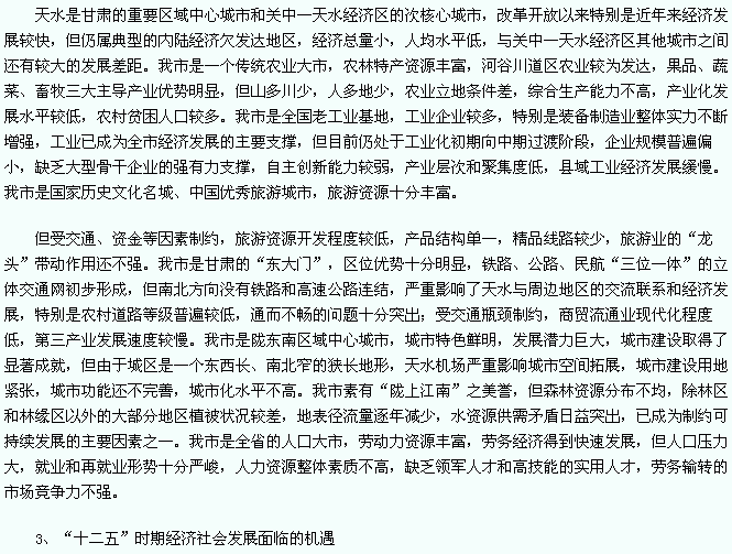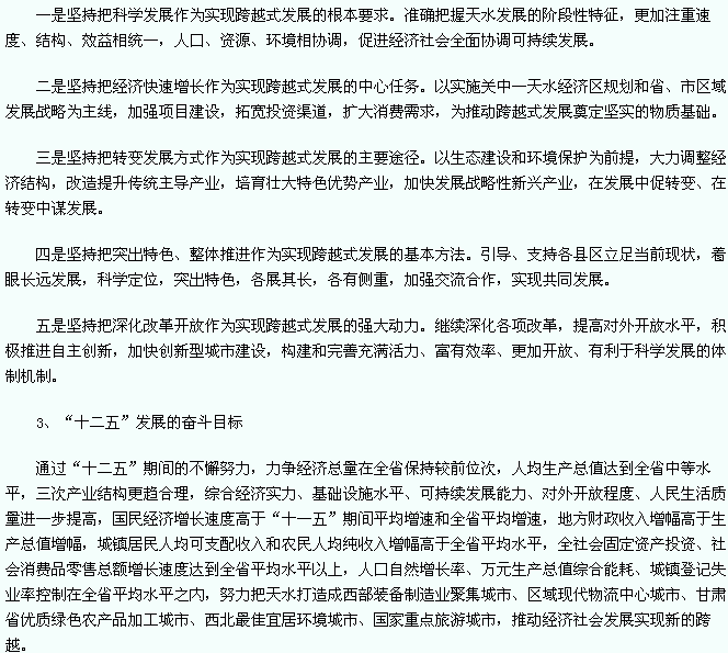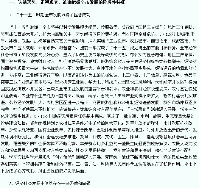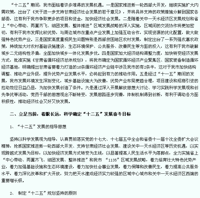 ??? “十二五”時(shí)期(2011—2015年),是實(shí)現(xiàn)天水市經(jīng)濟(jì)社會(huì)跨越式科學(xué)發(fā)展的關(guān)鍵時(shí)期??茖W(xué)制定天水市國民經(jīng)濟(jì)和社會(huì)發(fā)展第十二個(gè)五年規(guī)劃,對(duì)于深入貫徹落實(shí)科學(xué)發(fā)展觀,加快關(guān)中—天水經(jīng)濟(jì)區(qū)建設(shè),實(shí)施省委“中心帶動(dòng)、兩翼齊飛、組團(tuán)發(fā)展、整體推進(jìn)”和天水市“1135”區(qū)域發(fā)展戰(zhàn)略,推動(dòng)“十二五”時(shí)期全市經(jīng)濟(jì)社會(huì)又好又快發(fā)展,具有十分重大的意義。根據(jù)黨的十七大、十七屆五中全會(huì)和中共甘肅省委十一屆十次全委會(huì)議精神,結(jié)合天水市實(shí)際,經(jīng)中共天水市五屆十一次全委會(huì)研究,提出《關(guān)于制定國民經(jīng)濟(jì)和社會(huì)發(fā)展第十二個(gè)五年規(guī)劃的建議》。