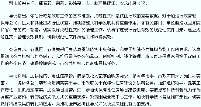 ??? 天天天水網(wǎng)-天水日報(記者 王小亞)11月25日,市委副書記、市長李文卿主持召開市政府第45次常務(wù)會議。會議聽取了規(guī)范性文件清理工作和經(jīng)濟適用住房建設(shè)有關(guān)事宜的匯報,審議了《關(guān)于加強公共機構(gòu)節(jié)能工作的實施意見》、《麥積山文學(xué)藝術(shù)獎評獎辦法》、《關(guān)于深化鄉(xiāng)鎮(zhèn)機構(gòu)改革的實施意見》,研究了2010年天水市科學(xué)技術(shù)獎評審等事項。??