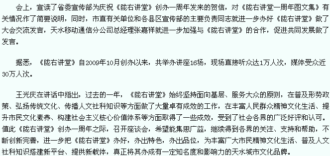 ??? 天天天水網(wǎng)-天水日?qǐng)?bào)(記者 王小亞)11月25日,慶祝“隴右講堂”創(chuàng)辦一周年座談會(huì)在天水賓館召開(kāi)。市委常委、宣傳部長(zhǎng)王光慶,市人大常委會(huì)副主任黃郁,市政協(xié)副主席雷傳昌,天水移動(dòng)通信分公司總經(jīng)理張嘉祥出席會(huì)議。???