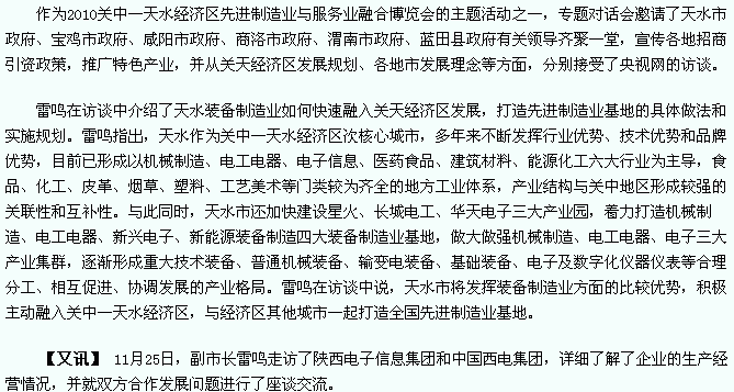 ??? 天天天水網(wǎng)-天水日報(bào)西安電(記者 孫鎮(zhèn))?11月26日,2010關(guān)中—天水經(jīng)濟(jì)區(qū)合作與發(fā)展市縣(區(qū))長專題對話會在西安曲江國際會展中心舉行。副市長雷鳴出席對話會并接受央視網(wǎng)的訪談。?
