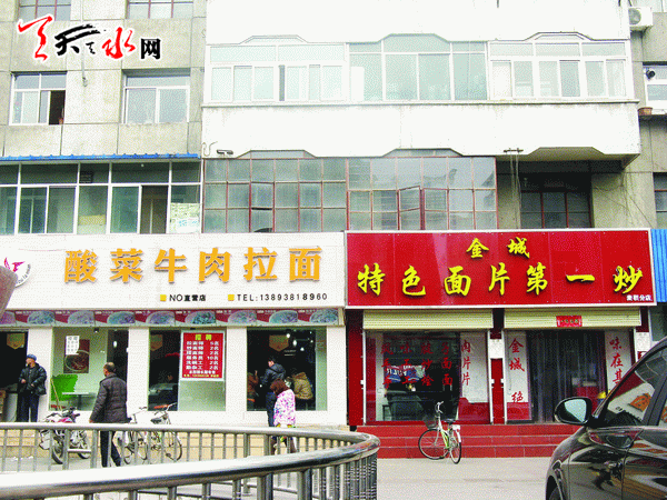 ????在王先生的帶領(lǐng)下,記者來(lái)到商埠路步行街西段,看到樓下這兩家沒(méi)有安裝除油煙設(shè)施的餐館,一家名為“酸菜牛肉面”,一家名為“金城特色面片第一炒”。