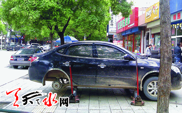 ????圖三:秦州區(qū)新華路東段,修車的、補胎的、給車“美容”的,一天到晚把路堵得死死的。在五中便橋頭,人行道被占用,車輛干脆停進了花壇里。