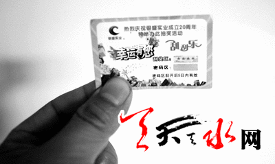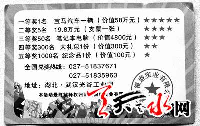 ????當(dāng)日中午,甘谷縣的陳先生到秦州區(qū)岷山路海林廠門口的一家面館吃飯。期間,他在餐桌下?lián)斓揭粡埢鸩窈心敲创蟮挠∮小肮喂螛贰弊謽拥莫勅*勅鎸懹小盁崃覒c祝銀盛實(shí)業(yè)成立20周年,特舉辦此抽獎活動”。背面的中獎規(guī)則是:一等獎為價(jià)值58萬元的寶馬汽車一輛;二等獎為價(jià)值19.8萬元的支票一張;三等獎為價(jià)值4800元的筆記本電腦一臺;四等獎為價(jià)值300元的大禮包一份;五等獎為價(jià)值100元的紀(jì)念品一份。