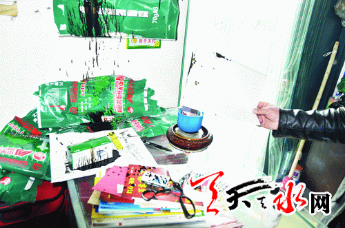 ????張先生告訴記者,當(dāng)日早上他正在店里干活,忽然聽(tīng)到柜臺(tái)上發(fā)出吧嗒吧嗒的聲響,抬頭一看,把他嚇了一跳,原來(lái)從天花板上直往下掉黑色油污,潔白的墻上被濺上了油污,靠墻邊的柜臺(tái)上面被弄得一蹋糊涂,放在柜臺(tái)上的雜志也濺上油污點(diǎn)。