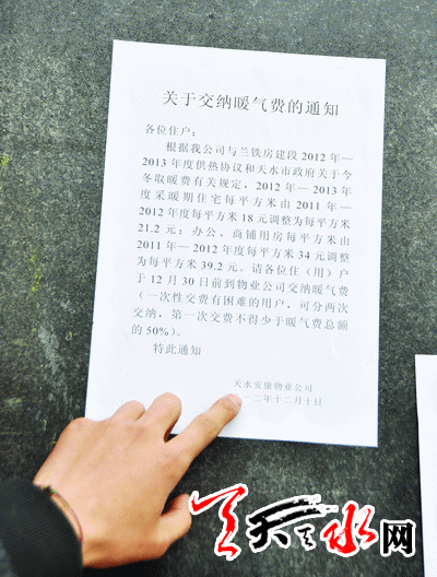 ????一位王姓住戶對(duì)記者說(shuō),安康家園暖氣不熱不說(shuō),還存在物業(yè)公司代收采暖費(fèi)過(guò)程中亂收費(fèi)的不合理現(xiàn)象。今年天水市調(diào)整了城區(qū)供熱價(jià)格,住戶家中的暖氣費(fèi)由一個(gè)采暖期18元調(diào)整為21.20元,工商業(yè)每平方米由一個(gè)采暖期30元調(diào)整為35.20元,機(jī)關(guān)事業(yè)單位每平方米由一個(gè)采暖期34元調(diào)整為39.20元。我在小區(qū)門前租有一間鋪面,鋪面收費(fèi)應(yīng)按工商業(yè)每平方米建筑面積一個(gè)采暖期35.20元收取,可就在前一段時(shí)間,物業(yè)公司張貼收費(fèi)通知,住戶家中收費(fèi)為21.20元不變,可商鋪收費(fèi)為39.20元。商鋪的暖氣費(fèi)是按機(jī)關(guān)事業(yè)單位每平方米一個(gè)采暖期39.20元的標(biāo)準(zhǔn)來(lái)收費(fèi)的,這明顯不合理。商鋪怎么能按39.20元來(lái)收呢?為此,在小區(qū)門前開(kāi)鋪面的商戶對(duì)此頗有意見(jiàn),可我們又不能不交,因?yàn)榘部导覉@住戶用電實(shí)行的是一戶一表制,電要在安康家園物業(yè)公司買。物業(yè)公司為了能收齊暖氣費(fèi),就把暖氣費(fèi)與電費(fèi)捆綁在一起,不交暖氣費(fèi)就不給你買電。