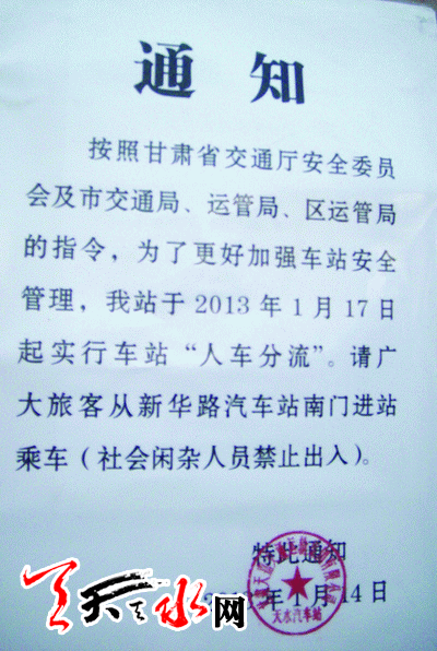 ????為何汽車站后門不容許乘客進站乘車了呢?記者在該站前、后門處由天水汽車站于1月14日發(fā)出的一紙通知上看到如下內容:根據(jù)甘肅省交通廳安全委員會及市交通局、運管局、區(qū)運管局指示,為了更好地加強車站安全管理,我站于2013年1月17日起實行車站“人車分流”。請廣大旅客,從新華路汽車站南門進站乘車(社會閑雜人員禁止進入。)