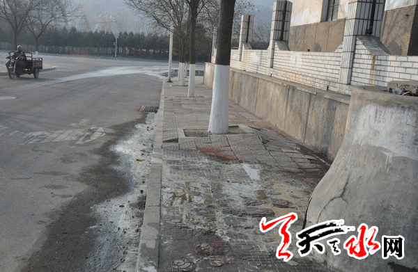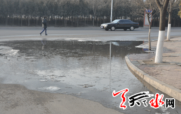 ????接到反映,記者來到藉河北路與迎賓橋左側(cè)的岔路口處,看到路面低洼處聚集著一大灘污水,污水呈黑黃色,上面飄著一些浮冰。人一走近,一股臭味就直鉆鼻腔。這灘污水占據(jù)了機(jī)動車道的一半路面,來往的車輛都遠(yuǎn)遠(yuǎn)地避開污水灘而行。