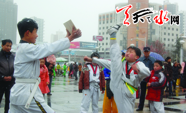 ????天天天水網(wǎng)-天水晚報訊(記者王琳 實習(xí)生曾潔 雷慧彥)2月18日,天水市普降瑞雪。春寒料峭、雪花飛揚的龍城廣場上,一群武術(shù)愛好者在雪中演練。他們精彩的演練,給今年的春節(jié)增添了濃濃的年味,讓過往市民大聲叫好。