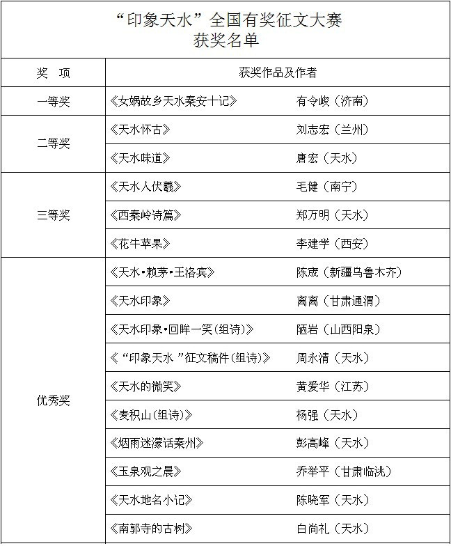 3月9日上午,經(jīng)由國內(nèi)及甘肅省知名作家馬超、王若冰、王元中、雪瀟、周舟、汪渺、劉晉組成的評審組最終評定,山東濟(jì)南作者有令峻撰寫的《女媧故鄉(xiāng)天水秦安十記》獲得此次征文的一等獎,蘭州劉志宏的《天水懷古》和唐宏的《天水味道》獲得二等獎,毛健的《天水人伏羲》、鄭萬明的《西秦嶺詩篇》、李建學(xué)的《花牛蘋果》獲得三等獎,陳宬的《天水?賴茅?王洛賓》等十篇作品獲得優(yōu)秀獎。此次征文選出的優(yōu)秀作品的相應(yīng)獎金也將于近日發(fā)放,請獲獎作者近期與天水日報(bào)社天天天水網(wǎng)(電話0938-8390229)聯(lián)系,領(lǐng)取自己的獎金和獲獎證書。