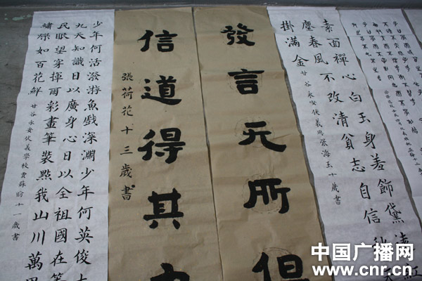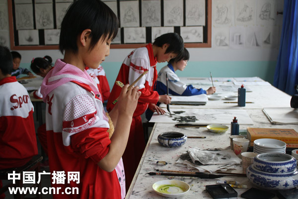 別看年紀(jì)不大,他們的一筆一劃都顯露出訓(xùn)練有素、成熟穩(wěn)健的風(fēng)骨。從工整端莊的毛筆小楷到線(xiàn)條細(xì)致的人物工筆,墻上掛滿(mǎn)了這些孩子們的書(shū)畫(huà)作品,讓人贊不絕口。而這些都得益于從2006年開(kāi)始的教育改革實(shí)驗(yàn)。如今,書(shū)法繪畫(huà)已經(jīng)成為他們每天的必修課。