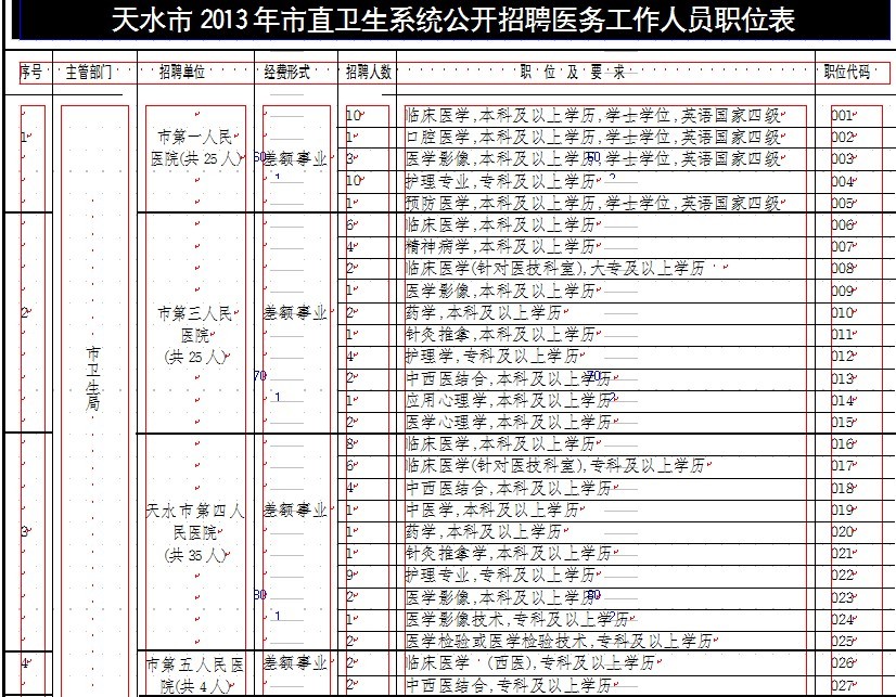 ????附件:1、天水市2013年市直衛(wèi)生系統(tǒng)公開招聘醫(yī)務(wù)工作人員職位表
