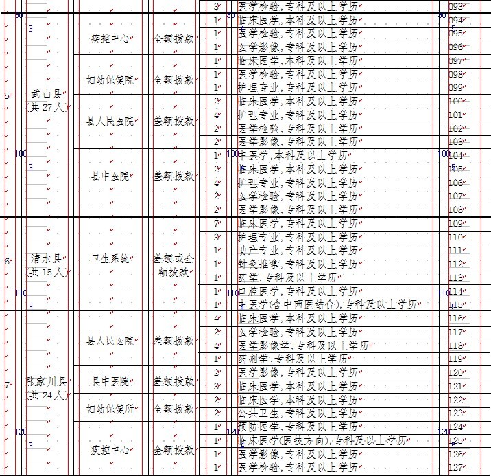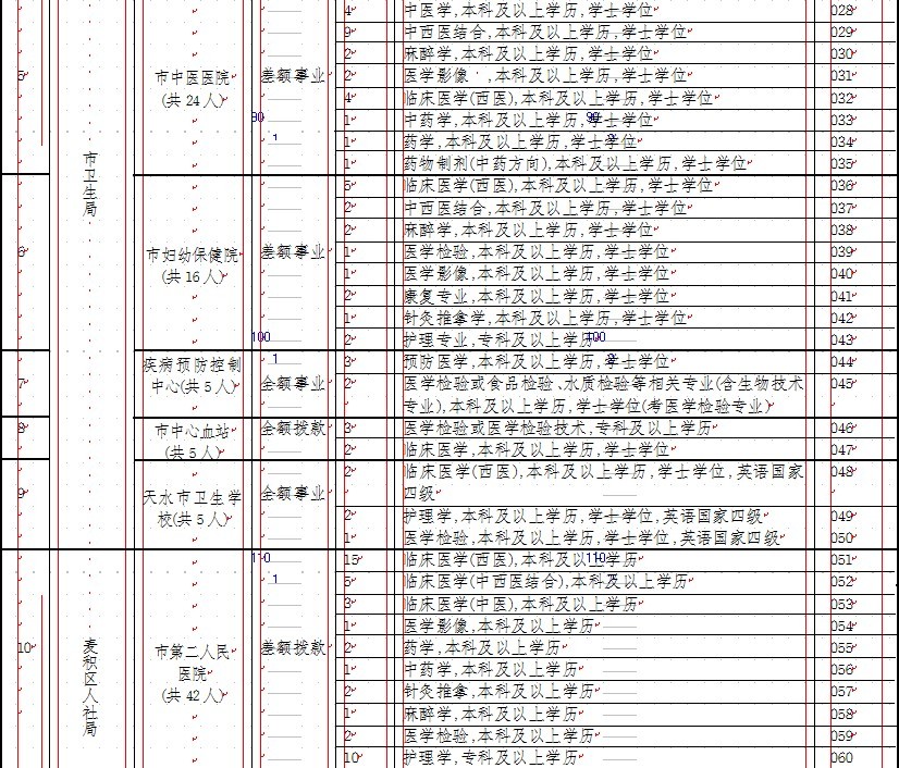 ????本次公開招聘計劃共346名。其中:秦州區(qū)10名,麥積區(qū)9名,秦安縣35名,甘谷縣40名,武山縣27名,清水縣15名,張家川縣24名;市第一人民醫(yī)院25名,市第三人民醫(yī)院25名,市第四人民醫(yī)院35名,市第五人民醫(yī)院4名,市中醫(yī)院24名,市婦幼保健院16名,市衛(wèi)校5名,市疾控中心5名,市中心血站5名,市第二人民醫(yī)院42名。