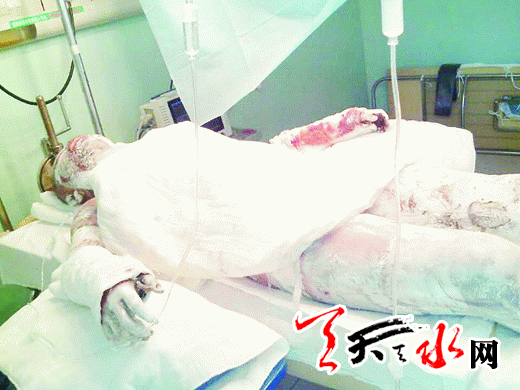 ????鞏芳田哽咽地告訴記者,她家住甘谷縣六峰鎮(zhèn)蒼耳王村,父親因病早逝,家中有70多歲的爺爺、67歲的奶奶、母親還有一個姐姐、兩個妹妹。小鞏和小妹隨媽媽的姓,大姐和三妹隨父親的姓。今年6月9日,正當(dāng)家家戶戶都開開心心地在一起準(zhǔn)備包粽子過端午的時候,小鞏突然接到爺爺打來的電話,爺爺在電話中用顫抖的聲音告訴她,媽媽鞏霞林和正在甘谷一中上學(xué)的三妹蔣佳秀因出租屋煤氣泄露發(fā)生爆炸,頃刻間,來不及逃脫的母親和妹妹被熊熊大火圍困,導(dǎo)致兩人全身嚴(yán)重?zé)齻?,現(xiàn)都在蘭州陸軍總院接受救治。至今五、六天了,妹妹剛剛脫離生命危險。經(jīng)診斷,母親和妹妹全身皮膚燒傷面積在80%-90%左右,每天需要一萬元的治療費(fèi),聽醫(yī)生說,兩人治愈至少要70萬元左右的費(fèi)用,可家里哪兒有能力支付這么龐大的費(fèi)用。聽完?duì)敔數(shù)脑V說,小鞏心如刀絞。