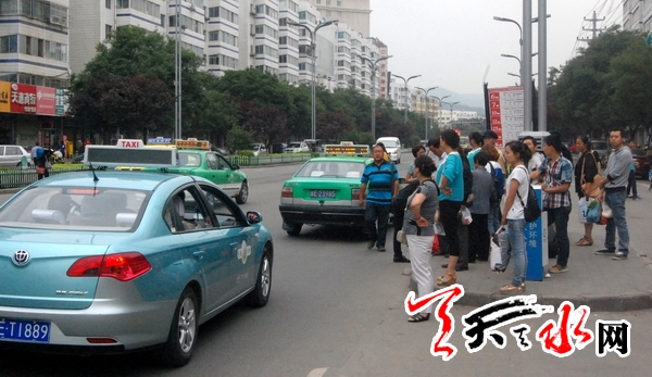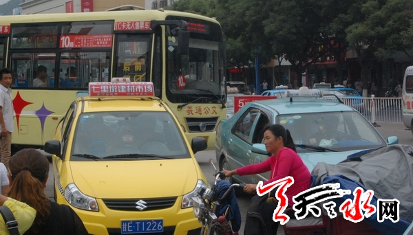 ????6月末的一個(gè)中午,天水火車站迎來(lái)許多剛下火車的人,其中一部分人來(lái)到火車站對(duì)面的公交車站等候1路公交車前往秦州區(qū)。不一會(huì)兒,接連3輛出租車??吭诠卉囌緝?nèi),其中兩名司機(jī)直接走下車來(lái)招呼乘客上車,另一位則坐在車中將頭伸向窗外攬客。他們一邊喊著:“市上的,市上的,每位十元?!奔幢丬嚿峡諢o(wú)一人仍不忘喊一句:“就差一人,上車就走?!贝藭r(shí),一輛由西邊開(kāi)來(lái)的1路公交車緩緩進(jìn)站,但由于出租車“鳩占鵲巢”,1路公交車無(wú)奈只得停靠在距離站臺(tái)約十米開(kāi)外的地方。盡管公交車司機(jī)不停地鳴喇叭,而此時(shí)一些乘客也向出租車司機(jī)喊道:“后面有公交車,你往前開(kāi)開(kāi),讓一下?!钡鲎廛囁緳C(jī)卻無(wú)動(dòng)于衷,乘客見(jiàn)狀,只得無(wú)奈繞道跑向站外的1路車。待乘客全部上完后,公交車又向后退了一段距離才調(diào)頭駛離車站。