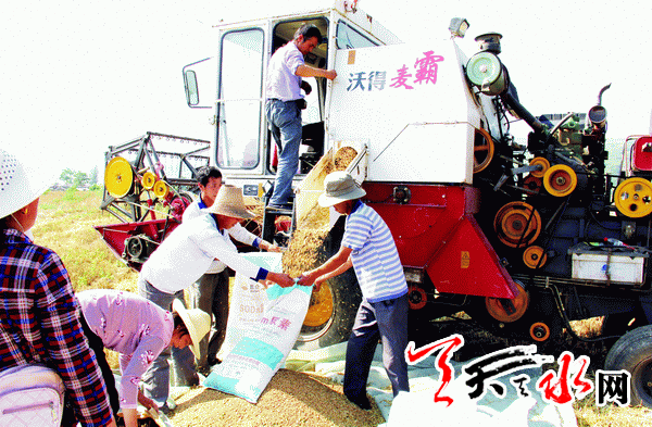 ????天天天水網(wǎng)訊(通訊員 樊馗)日前,記者在清水縣永清鎮(zhèn)馬溝村祝英臺塬上看到,在一片金黃色的麥田里一輛大型收割機(jī)正開足馬力來回收割小麥,男女老少頭頂烈日拾麥穗、整麥垛、裝麥粒,一派繁忙的景象。