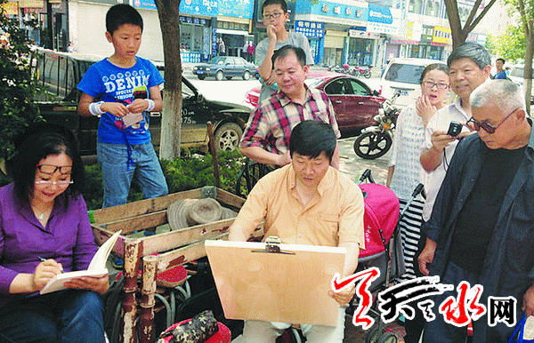 (天津畫家葉祖茂、香港畫家宮文琦(左)在天水街頭寫生。)