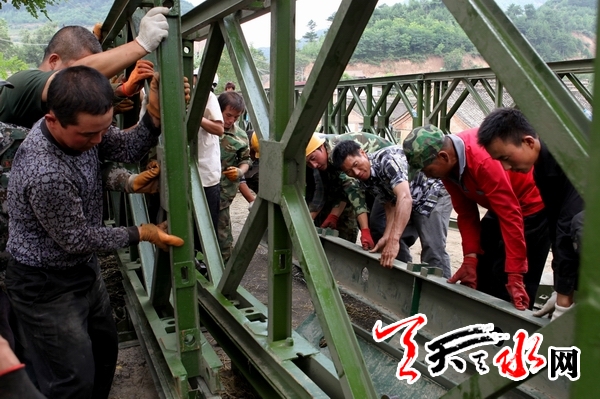 ??? 天天天水網(wǎng)訊 經(jīng)過(guò)市區(qū)交通運(yùn)輸部門的奮力搶修,被暴洪沖垮的秦州區(qū)娘娘壩鎮(zhèn)柳林村戰(zhàn)備鋼橋,于8月1日上午架設(shè)完成。該橋架設(shè)完成后,上李公路也將基本貫通,標(biāo)志著娘娘壩鎮(zhèn)受災(zāi)區(qū)域的28個(gè)行政村、96個(gè)自然村組對(duì)外交通的基本恢復(fù)通行。截至8月1日,娘娘壩鎮(zhèn)區(qū)域的縣道劉十公路、G316—廟川—花園—李子通道已全線搶通,這將為下一步救災(zāi)打下堅(jiān)實(shí)的基礎(chǔ)。