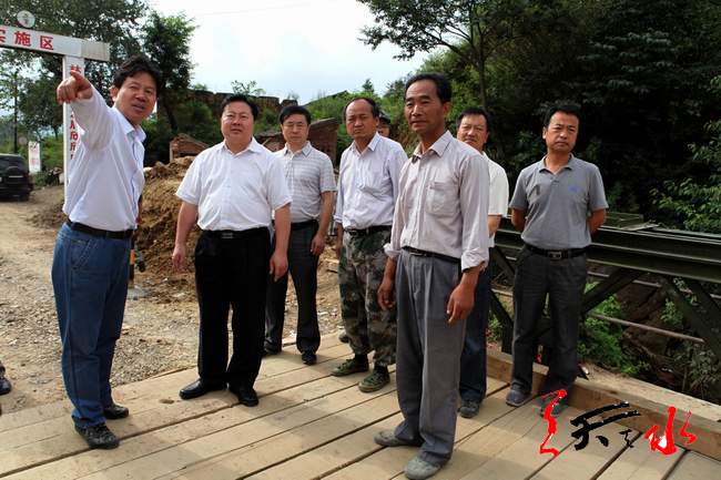 ??? 娘娘壩鎮(zhèn)柳林大橋在“7·25”暴洪災(zāi)情中被洪水沖毀,經(jīng)過交通系統(tǒng)的連續(xù)奮戰(zhàn),于8月2日在在柳林大橋原址上搭建了一座長42米、寬3.5米的戰(zhàn)備鋼架橋,打通了娘娘壩鎮(zhèn)南部7個行政村的搶險救災(zāi)通道。在柳林戰(zhàn)備鋼架橋上,馬世忠詳細察看了解了橋梁、橋基的建設(shè)情況,要求交通部門一定要做好橋基的加固工作,確保這條重要交通和搶險救災(zāi)通道安全暢通。