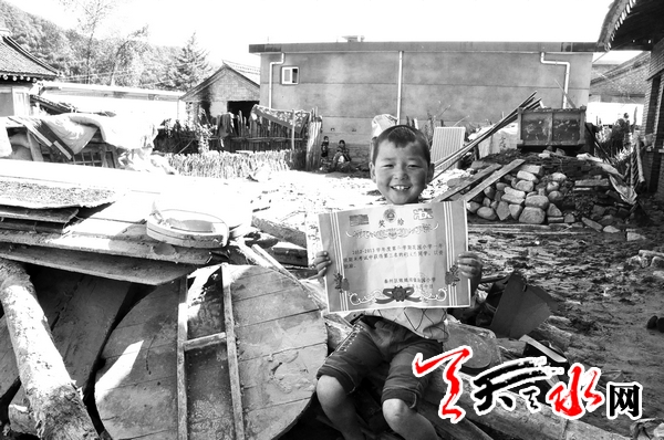 ??? 在洪水肆虐后的一片廢墟中,有一雙小手艱難地找尋著自己的一張獎(jiǎng)狀?;蛟S有人會(huì)認(rèn)為一張獎(jiǎng)狀就是一張紙而已,但在一個(gè)8歲孩子的心中,它卻比生命都珍貴。