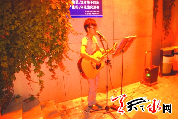 ??? 8月4日晚上,天水湖畔涼風(fēng)習(xí)習(xí),納涼休閑的人們?nèi)藖砣送?。在天河大酒店對面的湖畔邊,一陣吉他彈唱的聲音吸引了眾多市民?/p>