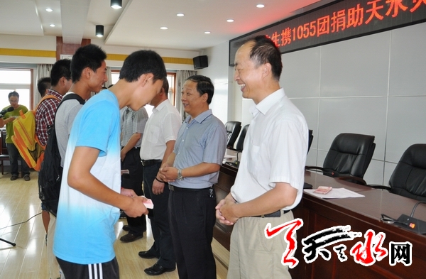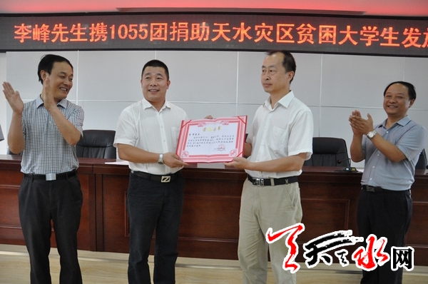 ????天天天水網(wǎng)訊【記者 馬放】8月11日上午,山東省煙臺(tái)市天水籍愛(ài)心人士李峰先生攜1055團(tuán)捐助天水市暴洪災(zāi)區(qū)貧困大學(xué)生10萬(wàn)元現(xiàn)金發(fā)放儀式在天水市民政局舉行,煙臺(tái)市天水籍愛(ài)心人士、1055團(tuán)組織部長(zhǎng)郭建東先生出席捐助儀式,親自將捐款發(fā)到20名貧困學(xué)生手中。