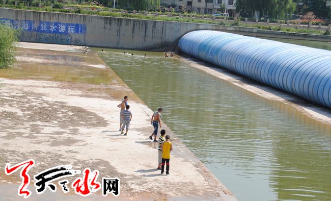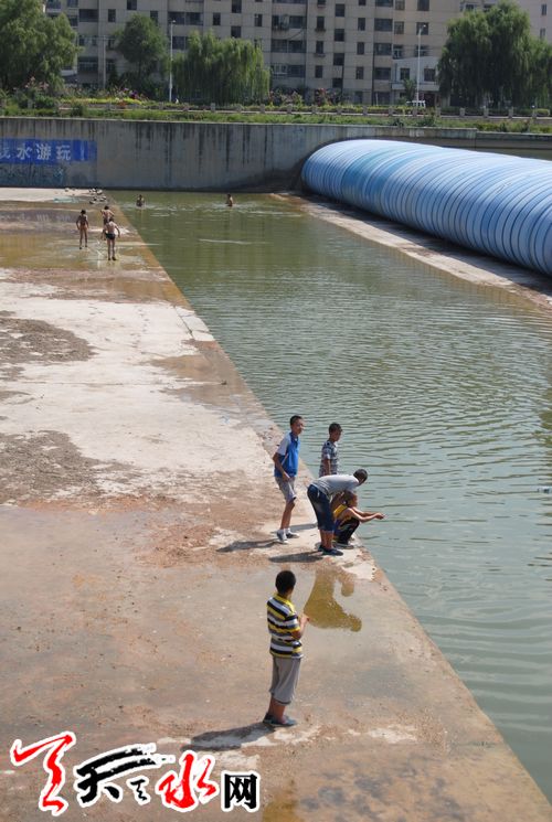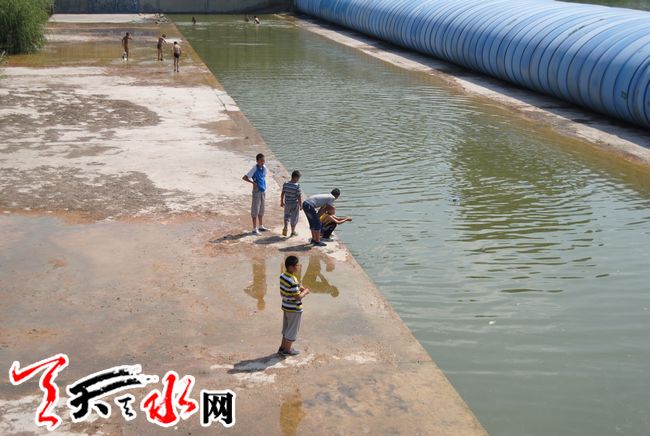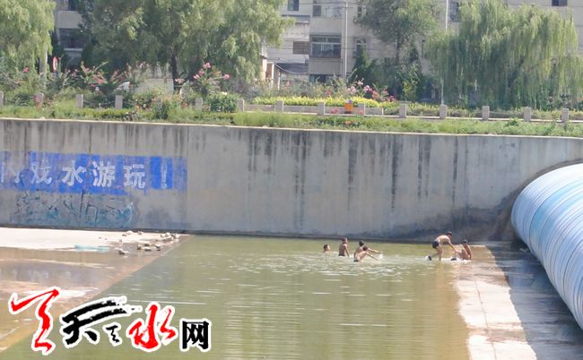 ????當(dāng)日下午,記者順著天水湖向花鳥市場行走,當(dāng)前行到天水湖像皮壩末端時,猛然聽到了孩童的打鬧聲和歡呼聲。走近一看,在像皮壩末端的蓄水池里,一群孩子正在盡情地在水池里嬉水,有的爬在水中學(xué)蛙泳,有的在水里直打滾,有的拿著長線在釣魚,有的互相扭打在一起,玩得不亦樂乎。見此情景,記者趕忙用相機(jī)拍下了這一幕。