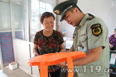 ????圖2:老人認(rèn)真聽消防官兵介紹消防知識(shí)