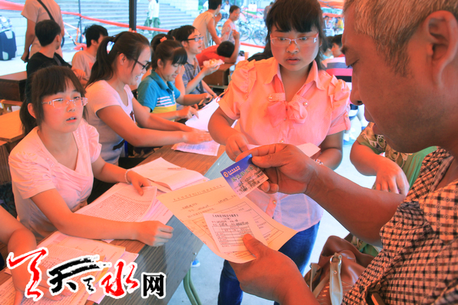 天天天水網(wǎng)訊(見(jiàn)習(xí)記者 韓鐵英)沉寂了兩個(gè)月的大學(xué)校園再次熱鬧起來(lái)。8月25日上午,天水師范學(xué)院2013級(jí)新生開(kāi)始報(bào)到,近4000名新生在家長(zhǎng)的護(hù)送陪同下,陸續(xù)來(lái)到學(xué)校報(bào)到。報(bào)名現(xiàn)場(chǎng)盡是忙碌的身影。