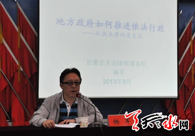 ??? 天天天水網(wǎng)訊(記者 呂薇)9月24日下午,天水市人民政府舉辦《地方政府如何推進(jìn)依法行政》專題法制講座,邀請(qǐng)?zhí)m州大學(xué)法學(xué)院客座教授、碩士研究生校外輔導(dǎo)教師、甘肅正天合律師事務(wù)所副主任楊軍就地方政府如何推進(jìn)依法行政進(jìn)行了專題輔導(dǎo)。
