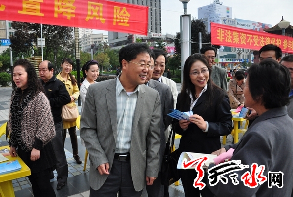 ????天天天水網(wǎng)訊(記者 孫鎮(zhèn))9月27日,天水市整治非法集資領(lǐng)導(dǎo)小組辦公室在龍城廣場組織開展了金融知識(shí)及打擊非法集資集中宣傳活動(dòng)。銀行、保險(xiǎn)、投資咨詢、投資擔(dān)保、典當(dāng)、證券等40多家金融單位和部門通過發(fā)放資料、設(shè)立展板、懸掛橫幅、推介金融產(chǎn)品等方式,向廣大市民宣傳金融法律法規(guī)、金融風(fēng)險(xiǎn)防范及金融信用征信等知識(shí),倡導(dǎo)公眾提高金融意識(shí),培養(yǎng)正確的投融資理念。天水市副市長徐慶宏視察了集中宣傳活動(dòng)。