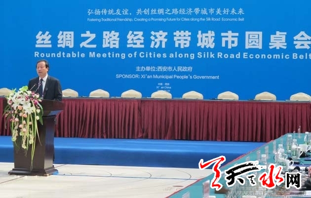 ????天天天水網(wǎng)訊(記者 漆艷)9月27日,絲綢之路經(jīng)濟(jì)帶城市圓桌會在古城西安舉行。意大利龐貝市、卡布拉羅拉市、伊朗伊斯法罕市、烏茲別克斯坦撒馬爾罕市、亞美尼亞久姆里市、印度新德里市、葡萄牙里斯本市、等9個絲綢之路國外城市代表團(tuán)和烏魯木齊、蘭州、銀川、敦煌、武威、天水、寶雞、咸陽等9個絲綢之路國內(nèi)城市代表團(tuán)的代表,緊緊圍繞習(xí)近平總書記倡導(dǎo)的共建“絲綢之路經(jīng)濟(jì)帶”構(gòu)想,就加強(qiáng)文化、旅游、貿(mào)易、科技、教育、衛(wèi)生等領(lǐng)域交流合作進(jìn)行了發(fā)言。
