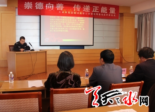 ????天天天水網(wǎng)訊【記者蔚軍平 通訊員付美蘭】9月26日上午,秦州區(qū)大城街道道德講堂第三講在光明巷社區(qū)開講,街道社區(qū)全體干部職工及居民代表90多人參加了活動(dòng)。